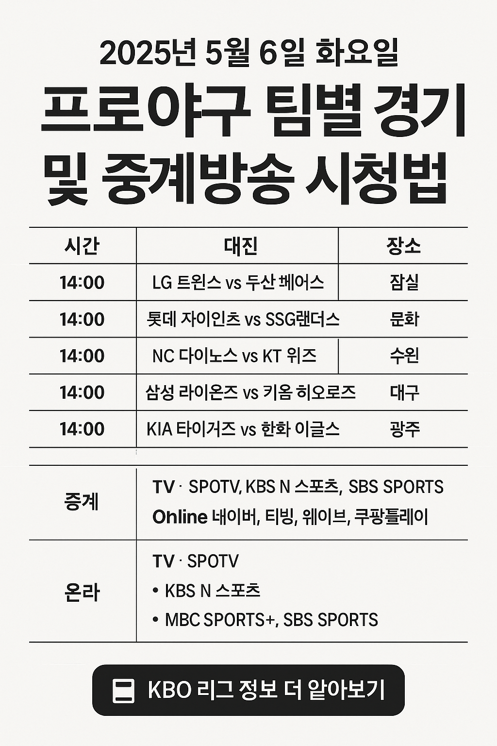 야구 팬 여러분, 안녕하세요! 5월 6일 화요일, 프로야구의 열기가 한층 더 뜨거워지고 있습니다. 오늘은 각 팀별 경기 일정과 중계방송 시청 방법에 대해 안내해 드리겠습니다. 야구장을 찾으시거나 TV로 시청하실 분들께 유용한 정보가 되길 바랍니다.