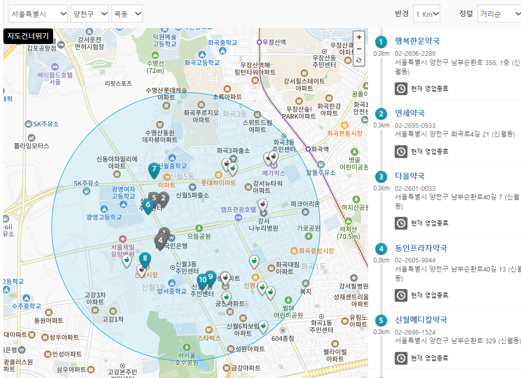 5. 오른편에 약국의 상호가 나오며, 현재 영업을 하는지 까지 잘 설명됩니다.