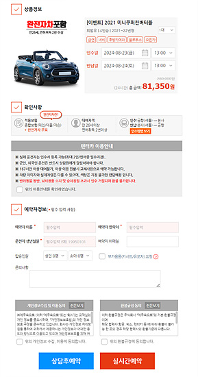 차량선택 후, 확인 사항 확인 및 예약자 정보 입력 실시간 예약을 하시면 결재 후 카카오톡으로 예약 정보가 발송이 됩니다.