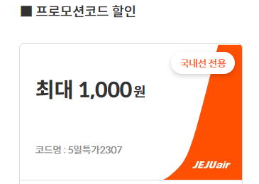 급하게 여행을 가시는 분들에게 추천드리며, 항공권 구매 시 제주항공 앱을 통해서 프로모션 코드 "5일특가2307" 입력하셔서 1,000원 추가 할인 해택을 받으시기 바랍니다.